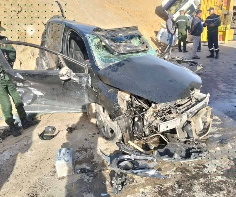 الحادث تمثَّل في انحراف وانقلاب شاحنة ذات مقطورة واصطدامها بسيارة بالطريق الوطني رقم 06 عند مدخل الطريق المزدوج.